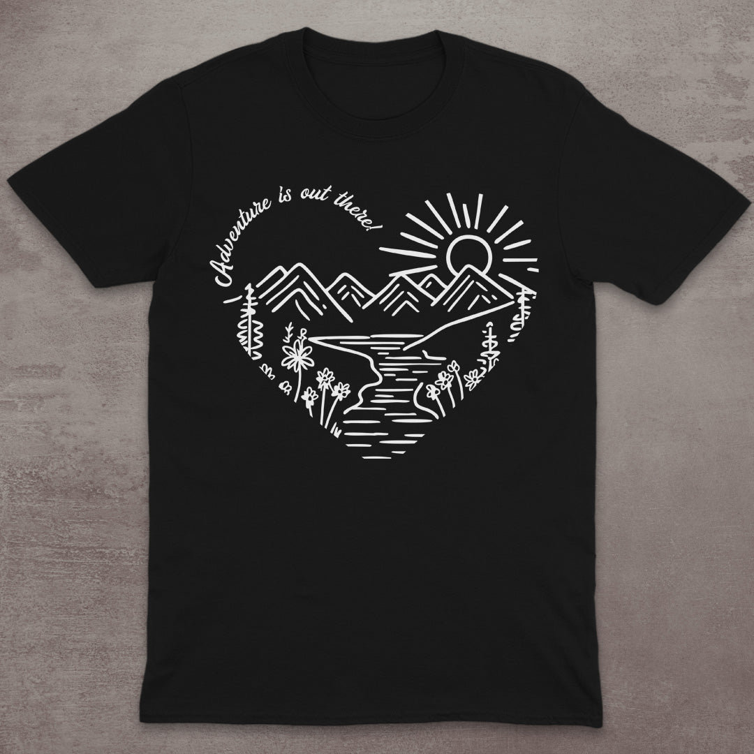 Celebrate your love for the great outdoors with this heart-shaped wilderness scene T-Shirt. Featuring hand-drawn mountains, trees, a river, and a radiant sun, it’s paired with the inspiring phrase "Adventure is out there!"—perfect for nature lovers, hikers, and dreamers with a wild heart.