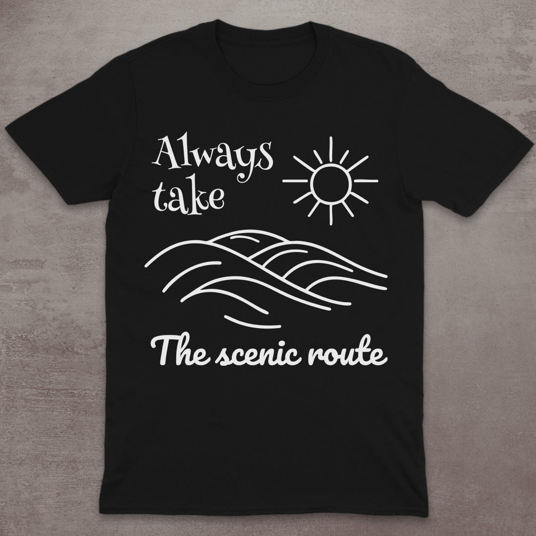 Embrace the journey, not just the destination with this "Always Take the Scenic Route" T-Shirt. Featuring flowing hills, a radiant sun, and whimsical typography, this design is perfect for free spirits, road trippers, and anyone who finds beauty off the beaten path.