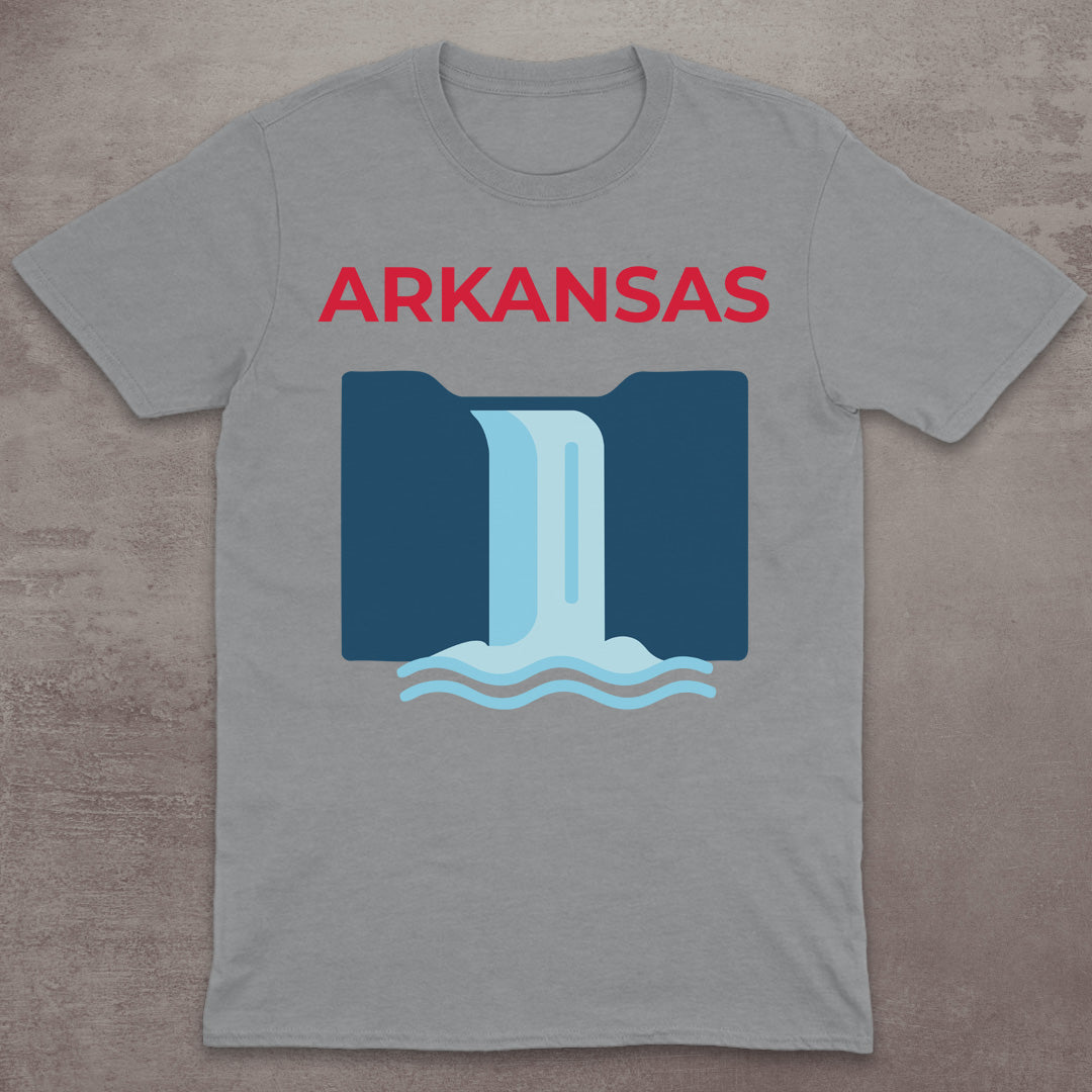 This minimalist Arkansas T-shirt captures the natural beauty of the stateâs iconic waterfalls. Designed with cool blues and bold reds drawn directly from the official Arkansas flag, itâs a refreshing tribute to outdoor adventure in The Natural State.