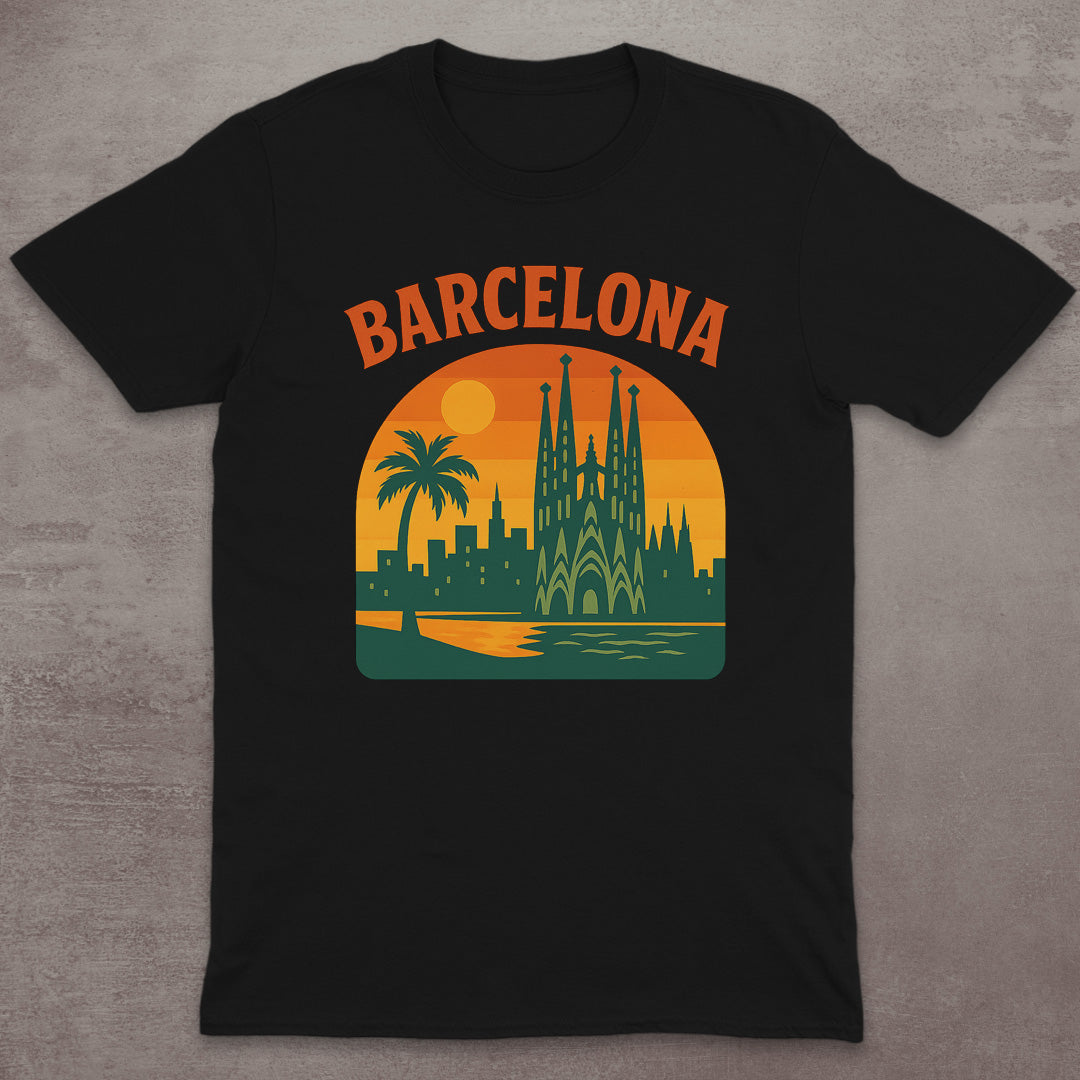 This Barcelona T-Shirt features a stylized city skyline with the iconic Sagrada FamĂlia and a bold sunset gradient in retro tones. Framed by palm trees and coastal silhouettes, itâs a graphic tribute to one of Spainâs most recognizable citiesâperfect for travelers, art lovers, and fans of Mediterranean vibes.