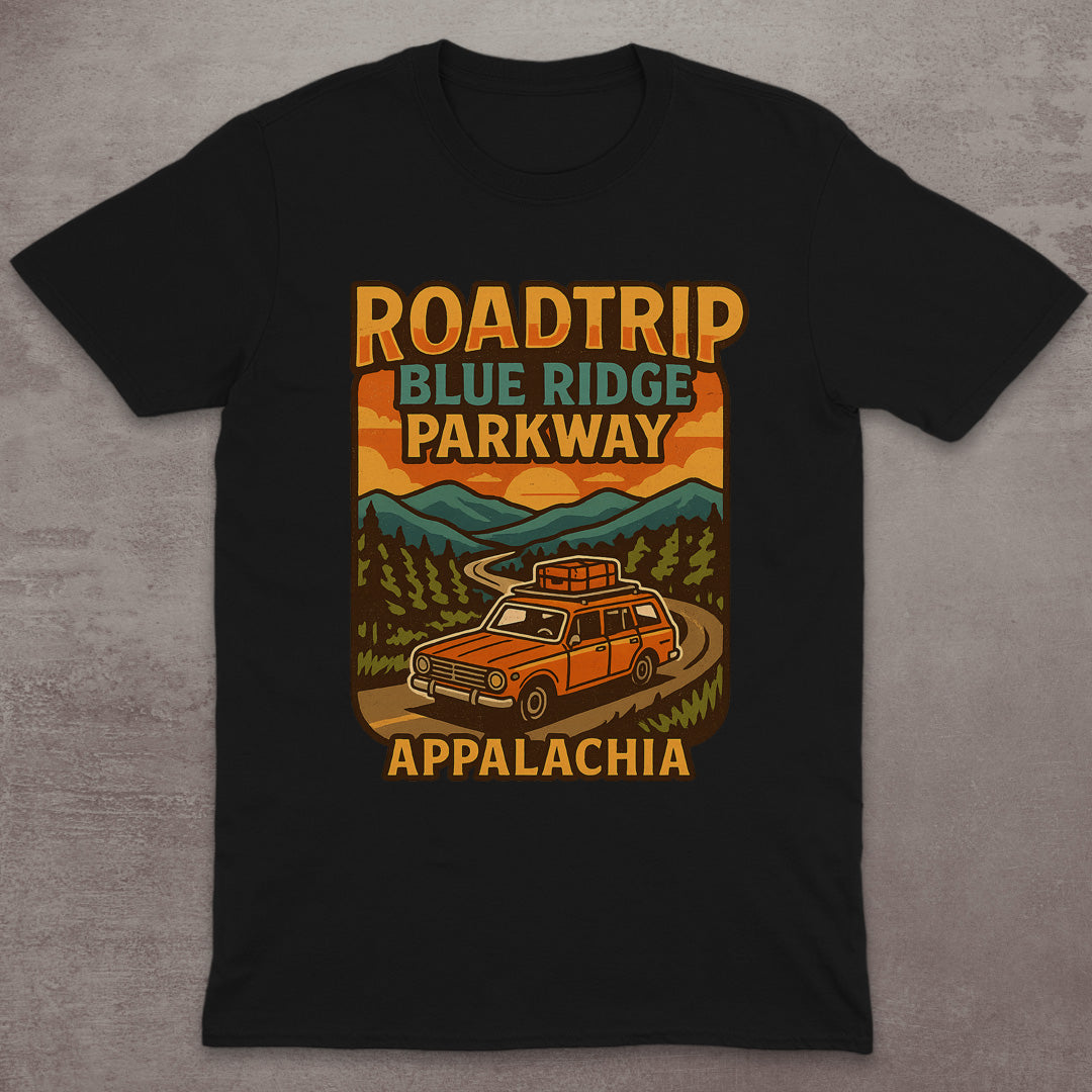 This retro-inspired T-Shirt celebrates the scenic Blue Ridge Parkway with a vintage station wagon winding through Appalachian hills. With bold typography and warm, nostalgic colors, it's perfect for nature lovers, road trippers, and fans of America’s favorite mountain drive.