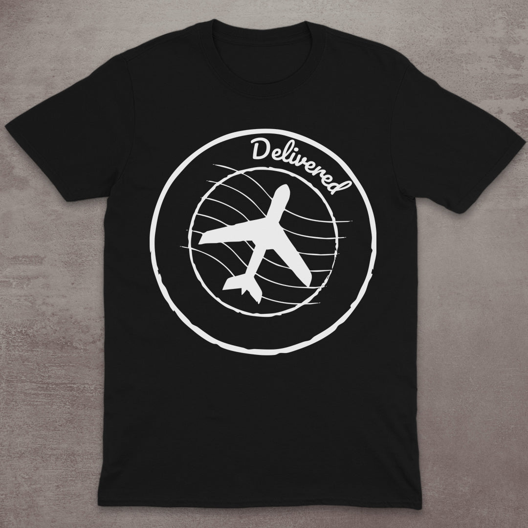 Make a statement wherever you land with this "Delivered" T-Shirt featuring a bold airplane design styled like a passport stamp. A perfect fit for frequent flyers, travel addicts, and anyone who lives to explore new destinationsâbecause your arrival always makes an impact.