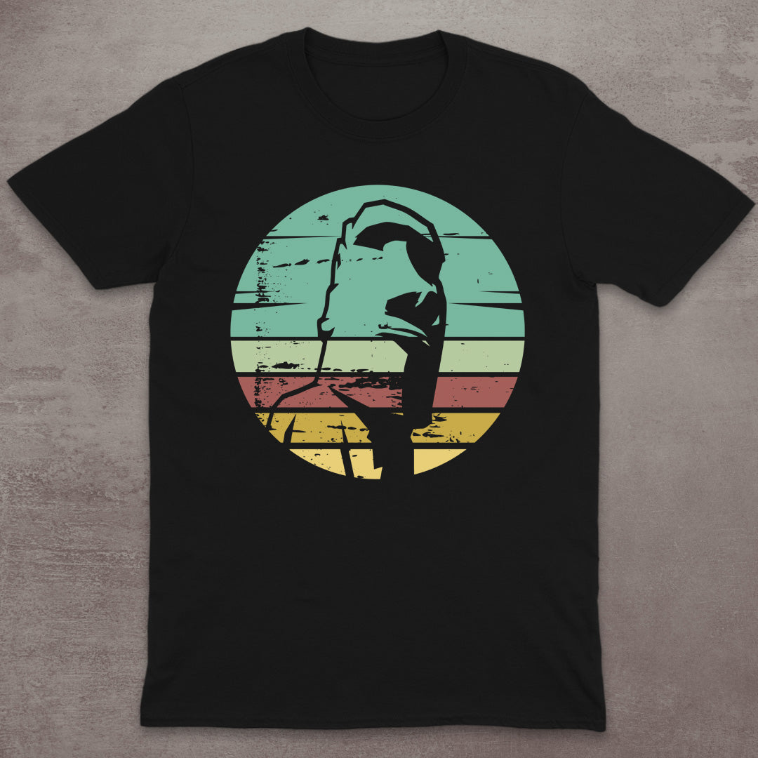 Ancient mystery meets retro style. This bold graphic pays tribute to the legendary Moai statues of Easter Island, framed in sun-washed stripes with a weathered, timeless look. A must-have for travel lovers, history buffs, or anyone drawn to the unknown.