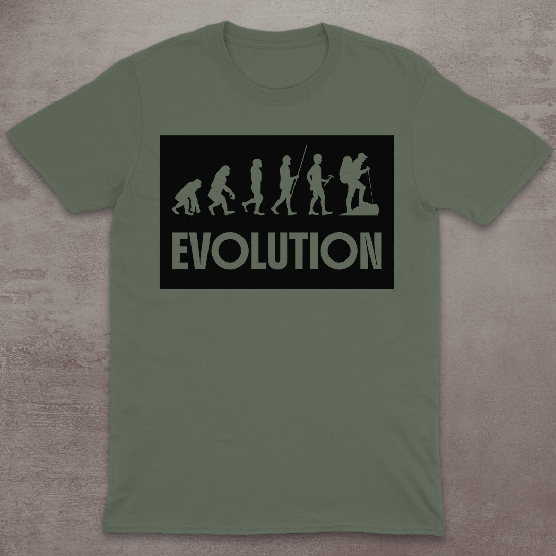 This clever "EVOLUTION" T-Shirt tracks the journey from early human to modern-day hiker in a bold silhouette graphic. A fun twist on the classic evolution chart, it’s perfect for those who believe adventure is the next step in human progress. Great for hikers, explorers, and lovers of the outdoors.