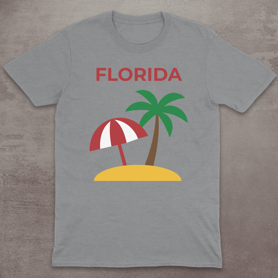Celebrate the sunshine and coastal charm of Florida with this minimalist beach scene design. Featuring a palm tree and umbrella on golden sand, the graphic uses red, white and yellow inspired by the official state flag for a vibrant, iconic look.
