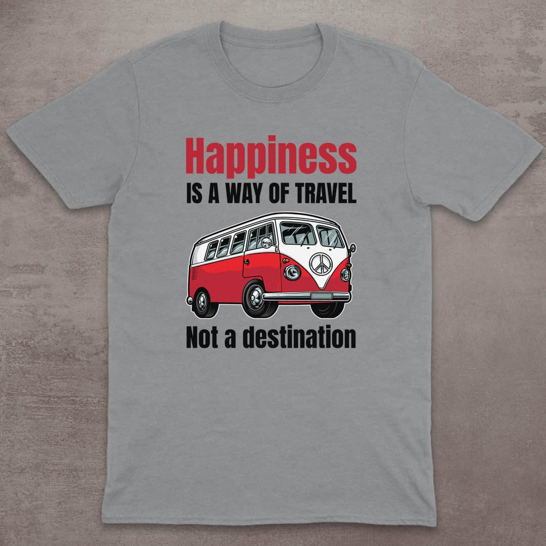 Embrace the journey with this retro-inspired T-Shirt featuring a classic red van and the quote "Happiness is a way of travel, not a destination." A cheerful design for road trippers, van life fans, and anyone who finds meaning in the ride, not just the arrival.