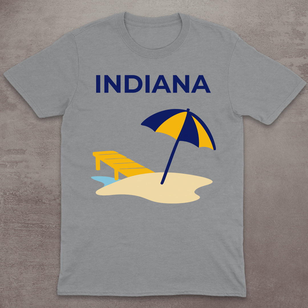 This Indiana-themed T-shirt captures a peaceful lakeside escape with a dock and beach umbrella. The golden yellow and deep blue color scheme directly reflects the hues of the Indiana state flag, giving the design both local charm and a bold visual pop.
