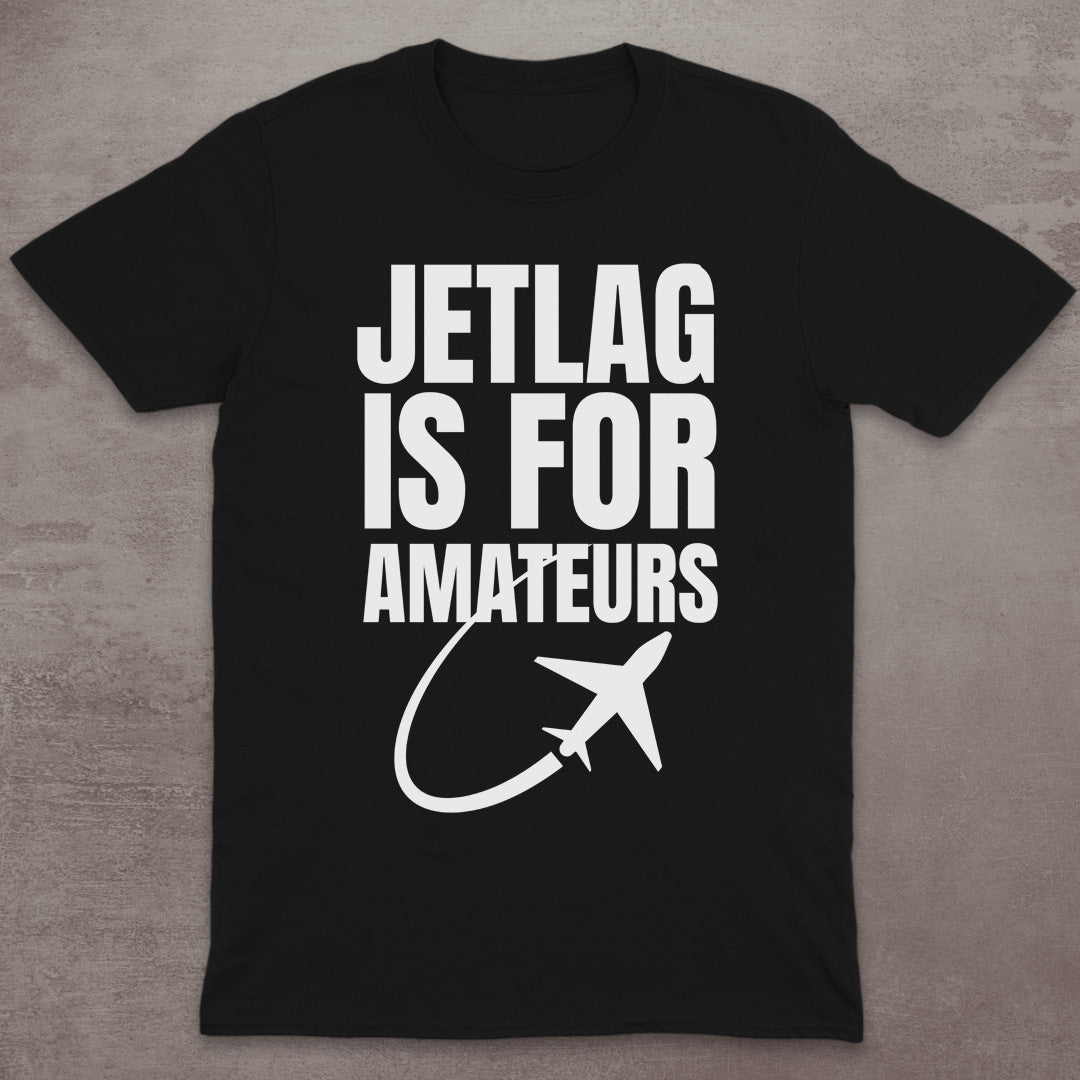For seasoned travelers who defy time zones, this “Jetlag Is for Amateurs” T-Shirt delivers bold energy and aviation style. With strong typography and a looping airplane graphic, it’s made for globetrotters who know how to travel hard and stay sharp.