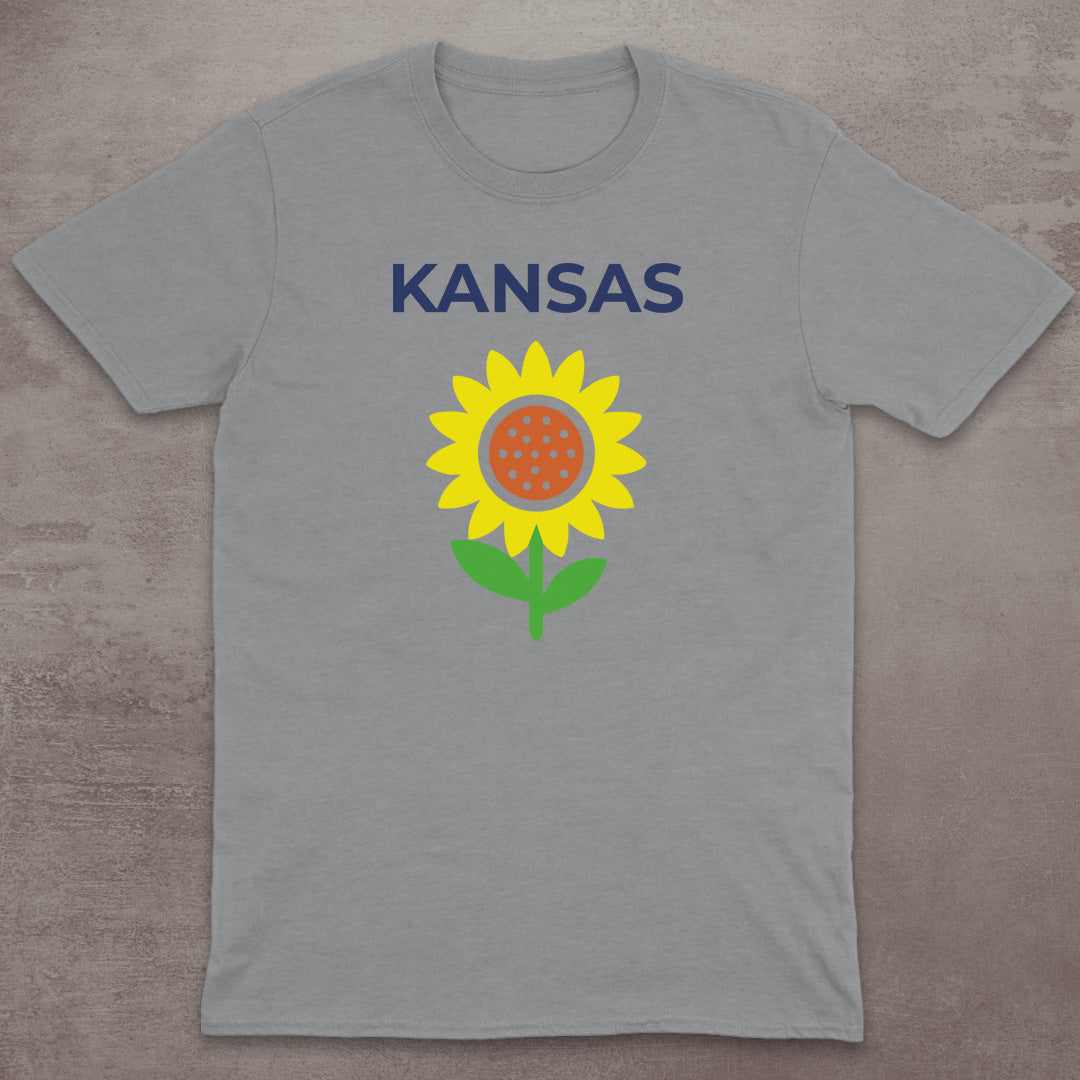 This Kansas T-Shirt features a clean, minimalist sunflower design that highlights the state's most iconic symbol. The color palette reflects the official flag, with deep blue text and warm yellow tones balanced by subtle green accents.
