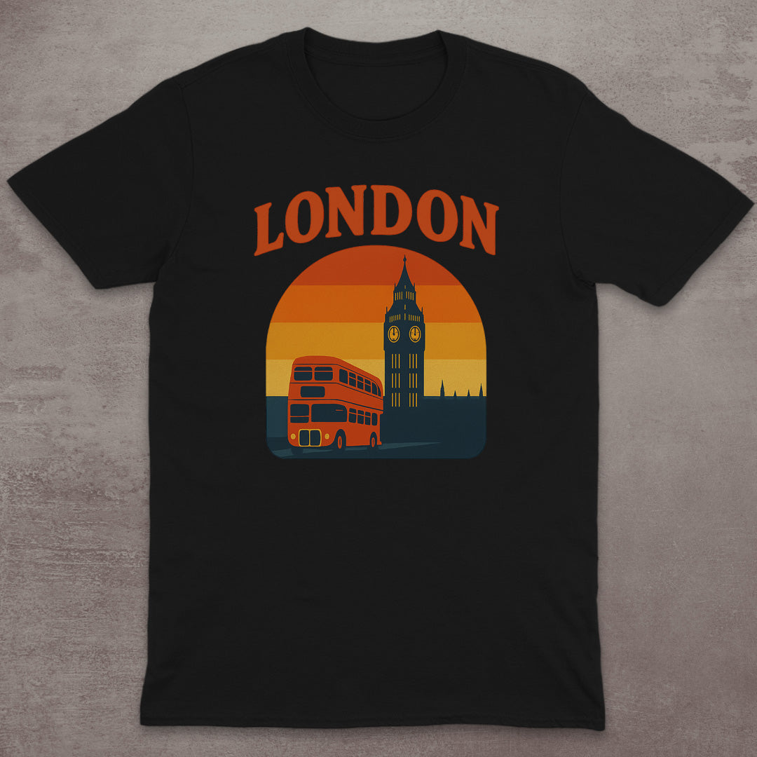 This London T-Shirt showcases a vintage-style illustration of Big Ben and a classic red double-decker bus, set against a warm retro sunset. With bold colors and clean lines, itâs a graphic nod to one of the worldâs most iconic citiesâdesigned for travelers, city lovers, and UK enthusiasts.