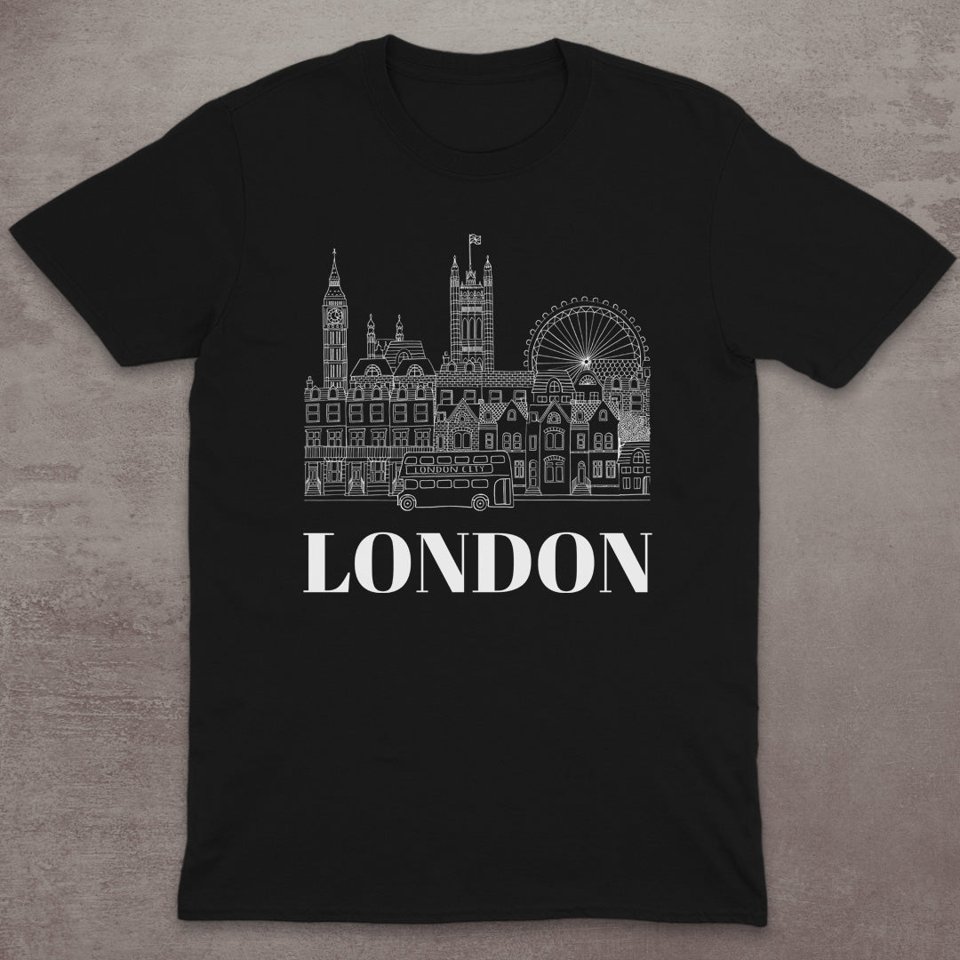 This London T-Shirt features a clean line art illustration of the city's most recognizable landmarks, including Big Ben, the London Eye, historic buildings, and classic double-decker buses. A balanced and detailed design for travelers, architecture enthusiasts, or anyone with a connection to one of Europeâs most iconic cities.