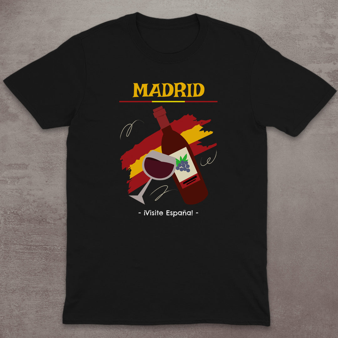 This vibrant Madrid T-Shirt features a bottle of red wine and a glass set against a brush-stroke Spanish flag backdrop. Complete with the phrase "ÂĄVisite España!," itâs a fun and flavorful tribute to Spanish cultureâperfect for foodies, wine lovers, and travel enthusiasts alike.