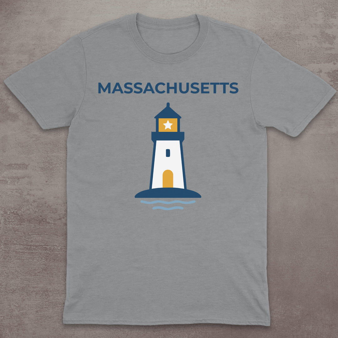 This minimalist lighthouse design celebrates the maritime legacy of Massachusetts with a crisp, clean style. The deep blue and golden tones reflect the official state flag colors, evoking both tradition and a coastal atmosphere.
