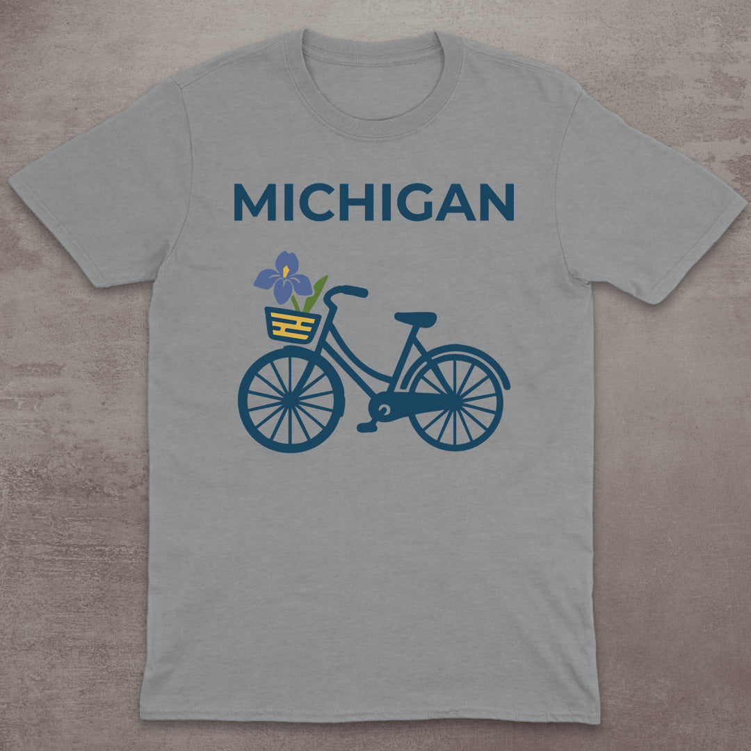 A calm summer ride through the Great Lakes State, where wildflowers bloom in the breeze. The Dwarf Lake Iris in the basket honors Michigan’s official state flower, while the blue and gold design reflects the colors of the state flag.