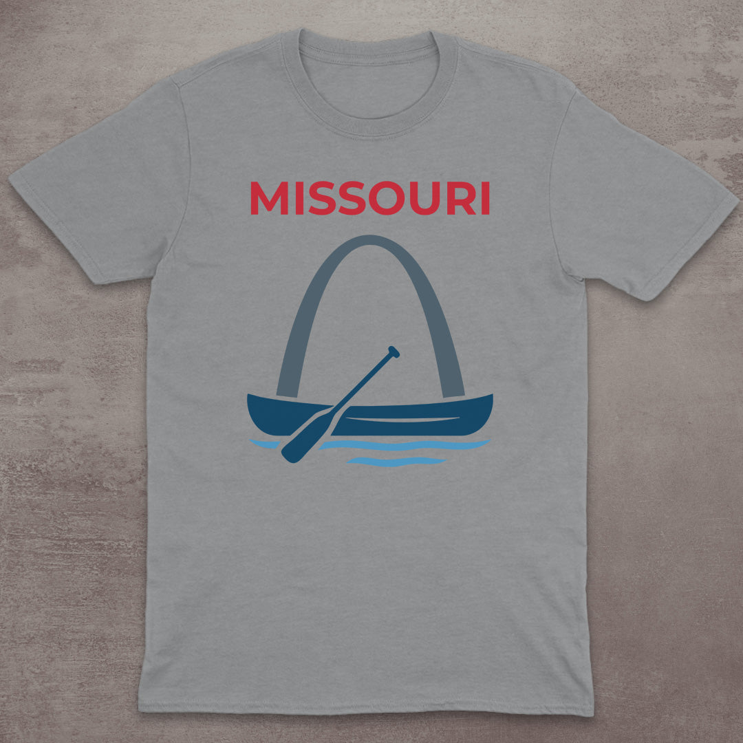 This design honors Missouriâs iconic river culture with a stylized canoe paddling beneath the Gateway Arch. Featuring red and blue accents found in both the state flag and the shirtâs print, itâs a laid-back tribute to outdoor life and local pride.