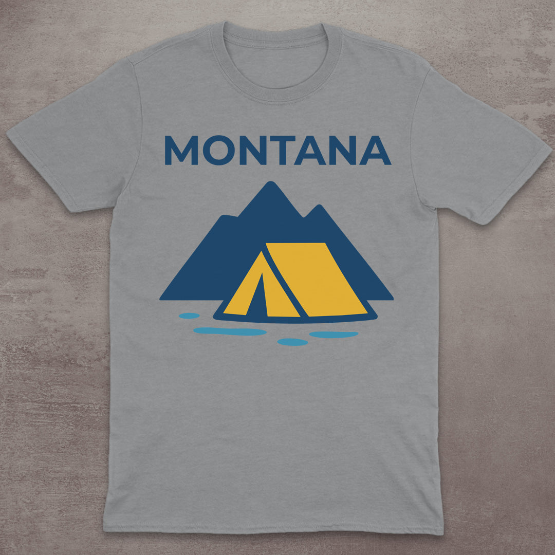 This minimalist Montana design captures the call of the wild with a tent pitched by tranquil mountain lakes. The deep blue and gold tones mirror the colors of the Montana state flag, blending state pride with the spirit of open-air exploration.