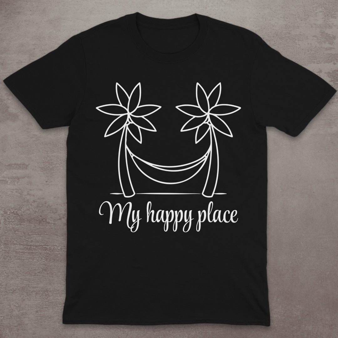 Find your calm in this "My Happy Place" T-Shirt, featuring a relaxed line art design of two palm trees holding up a hammock. With its breezy tropical vibe and elegant script, this shirt is ideal for anyone who dreams of slow days, sandy toes, and peaceful escapes.
