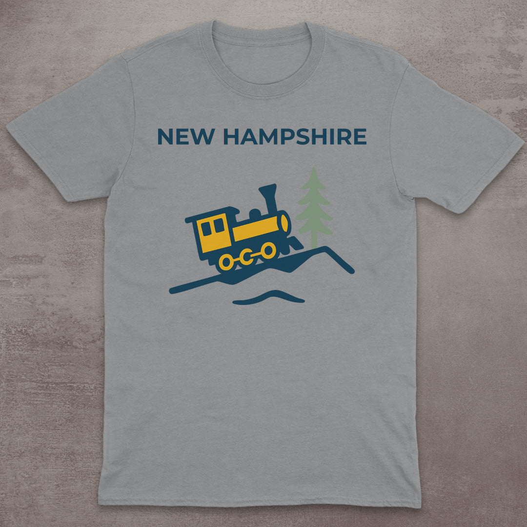 Celebrate the wild spirit of the Granite State with this minimalist mountain railway design. A yellow cogwheel train ascends through deep blue peaks, echoing the scenic routes of New Hampshire. The colors reflect the state flagâs palette of blue and gold.