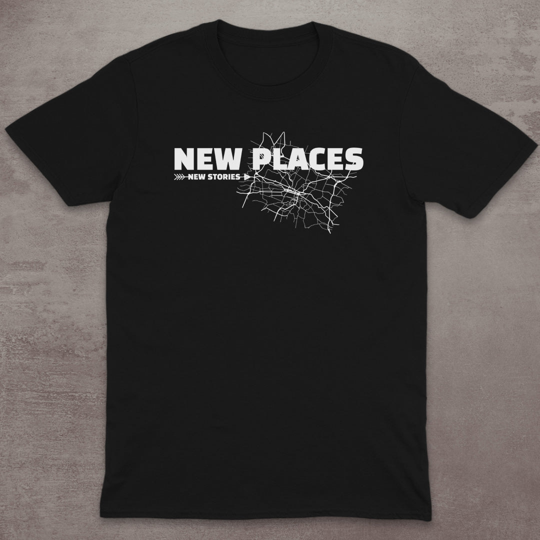 Celebrate your love for the unknown with this bold "New Places, New Stories" T-Shirt. Featuring striking typography and an abstract road map graphic, this design is perfect for curious souls, road trippers, and anyone who sees every journey as the start of a new chapter.