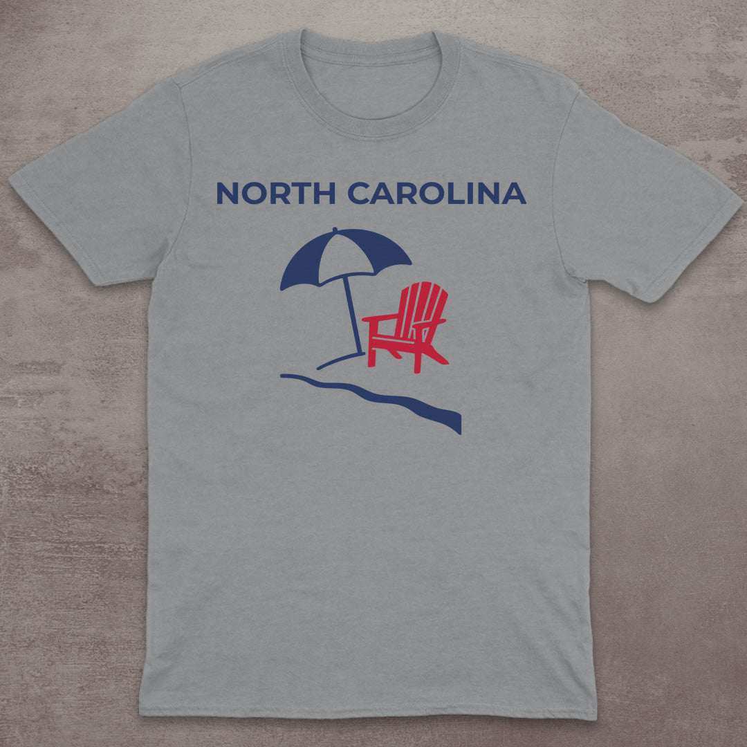 Capture the charm of the Outer Banks with this relaxed coastal design featuring an umbrella, an Adirondack chair, and ocean waves. The deep blue and red tones reflect the state flag colors, bringing a touch of North Carolina pride to beachside lounging.
