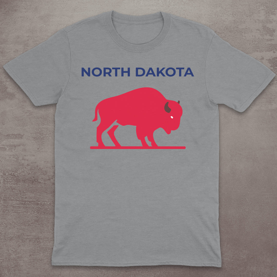 Celebrate the wide-open spirit of North Dakota with this bold bison graphic, a symbol of strength and heritage. The striking red and navy colors echo the state flag, grounding this design in the iconic imagery of the northern Great Plains.
