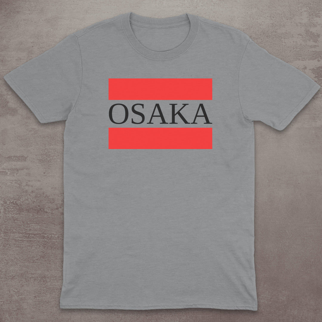 This Osaka T-Shirt features a clean, modern design with bold red bars framing the city name in sleek serif lettering. A stylish choice for fans of minimalist aesthetics, urban design, and Japanese city culture.