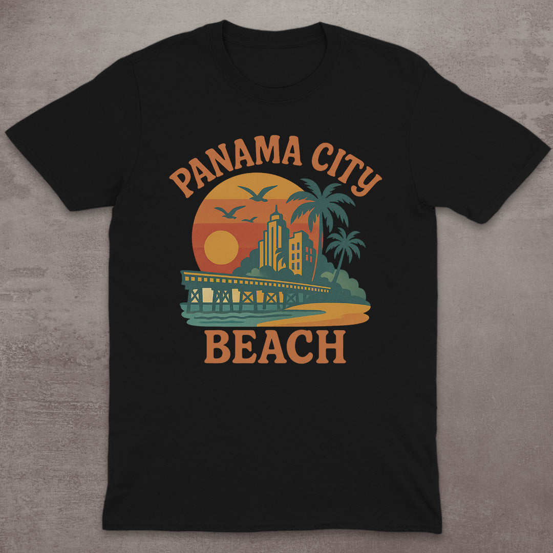 This Panama City Beach T-Shirt features a vintage-inspired coastal scene with palm trees, seagulls, a classic pier, and glowing sunset. With bold, beachy colors and nostalgic typography, it’s perfect for Florida vacationers, surf lovers, and fans of the Gulf Coast vibe.