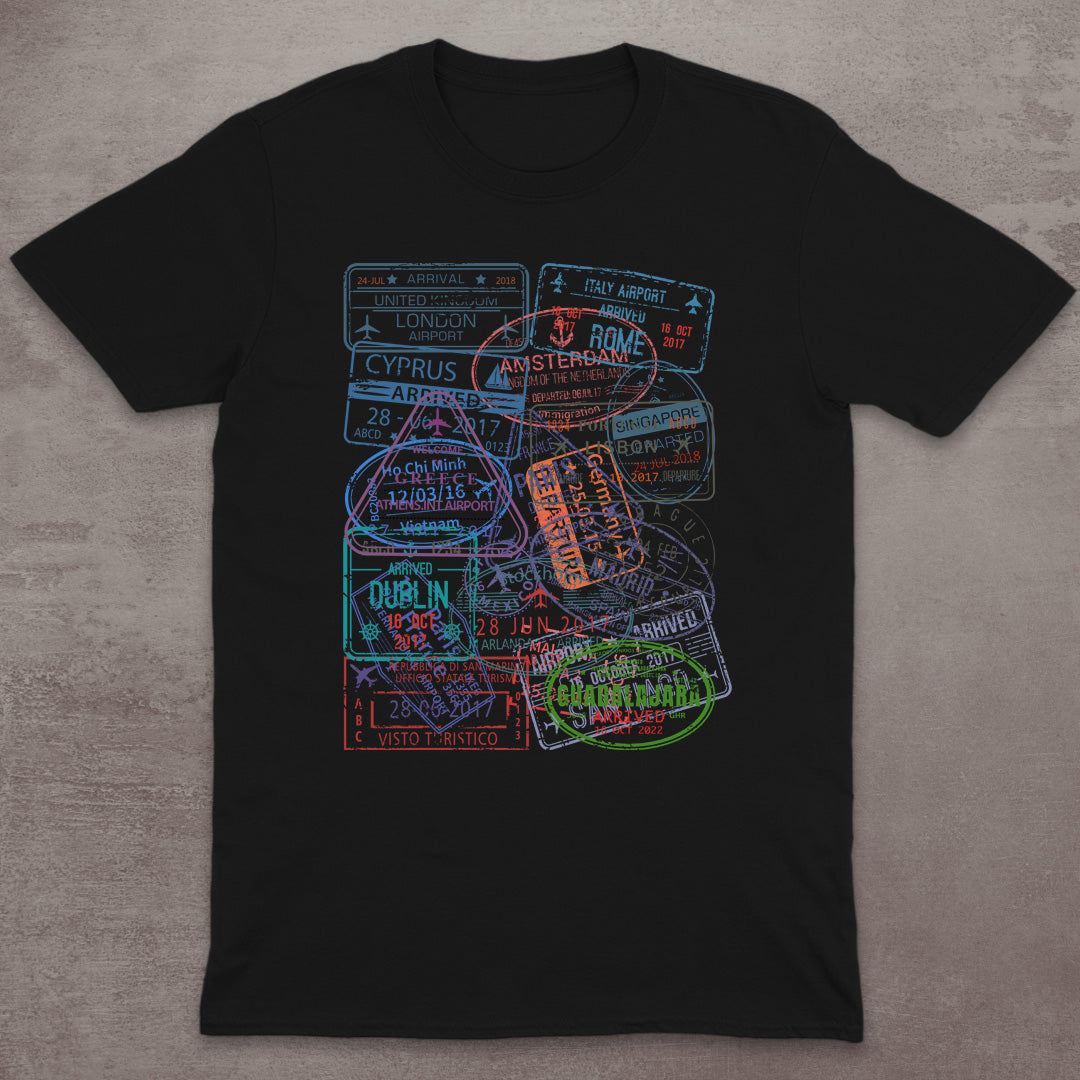 Wear your wanderlust. This colorful design is a collage of passport stamps from around the world, layered over a hidden globe-trotter’s essentials. Whether you're planning your next trip or reliving the last one, this tee is made for memories in motion.