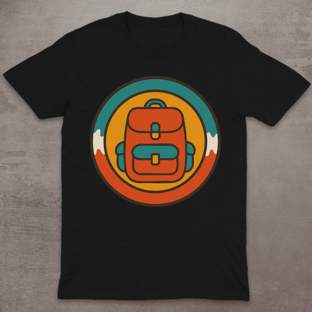 This T-Shirt features a bold, circular badge design with a stylized backpack at the center, surrounded by a warm retro color palette. A clean and modern tribute to hiking, travel, and adventure gear—perfect for backpackers, explorers, and lovers of the open road.