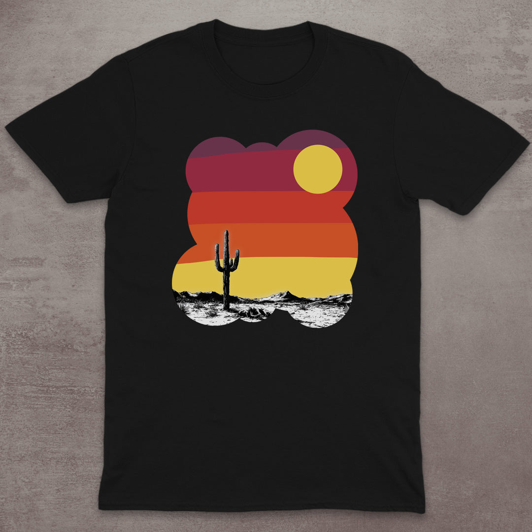 This artistic T-Shirt features a black-and-white desert landscape with a lone cactus, set beneath a bold retro sunset in warm gradient tones. A modern-meets-vintage design perfect for desert roamers, road trippers, and lovers of wide-open spaces.