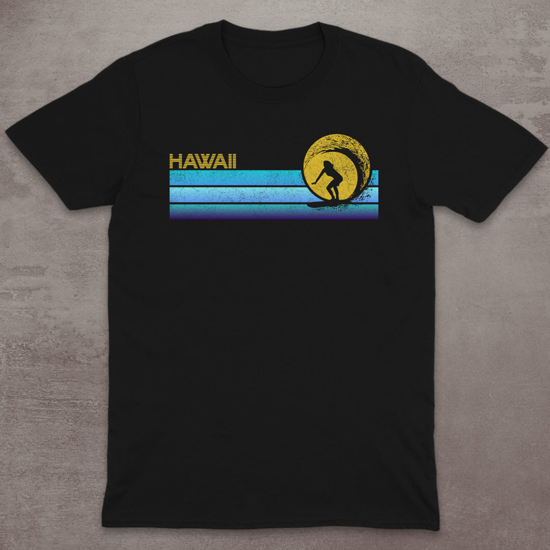 Chase the sun, ride the wave. This vintage-style Hawaii tee features a bold sunset, stylized stripes, and a surfer silhouette catching the perfect curl. Whether you surf or just live like you do, this tee brings tropical energy and old-school style in one perfect drop.