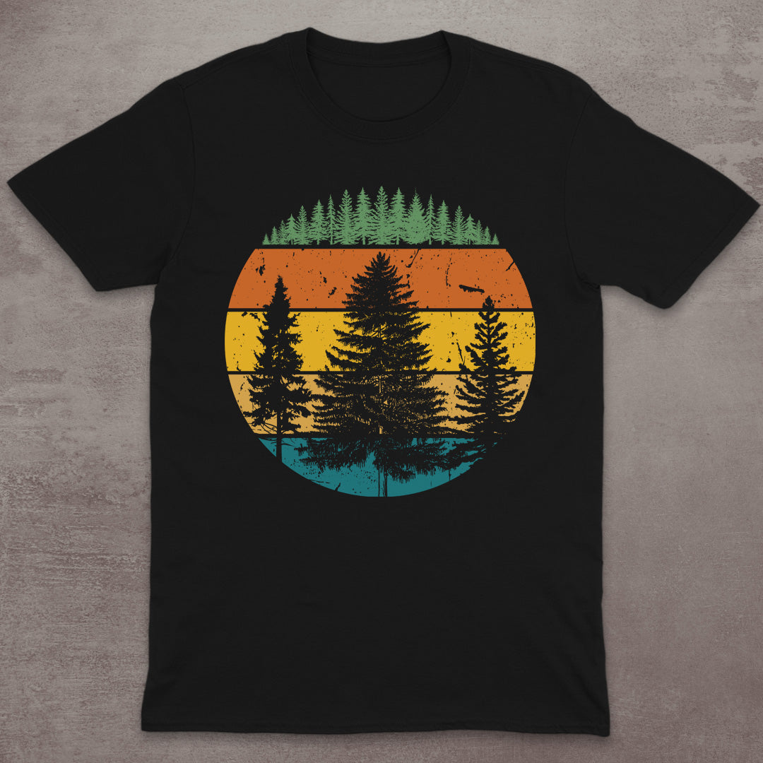 Where color meets the canopy. This distressed-style pine forest design brings vintage character to your love for the outdoors. Bold stripes and silhouetted trees create a timeless look for hikers, campers, and anyone who still finds magic in the woods.