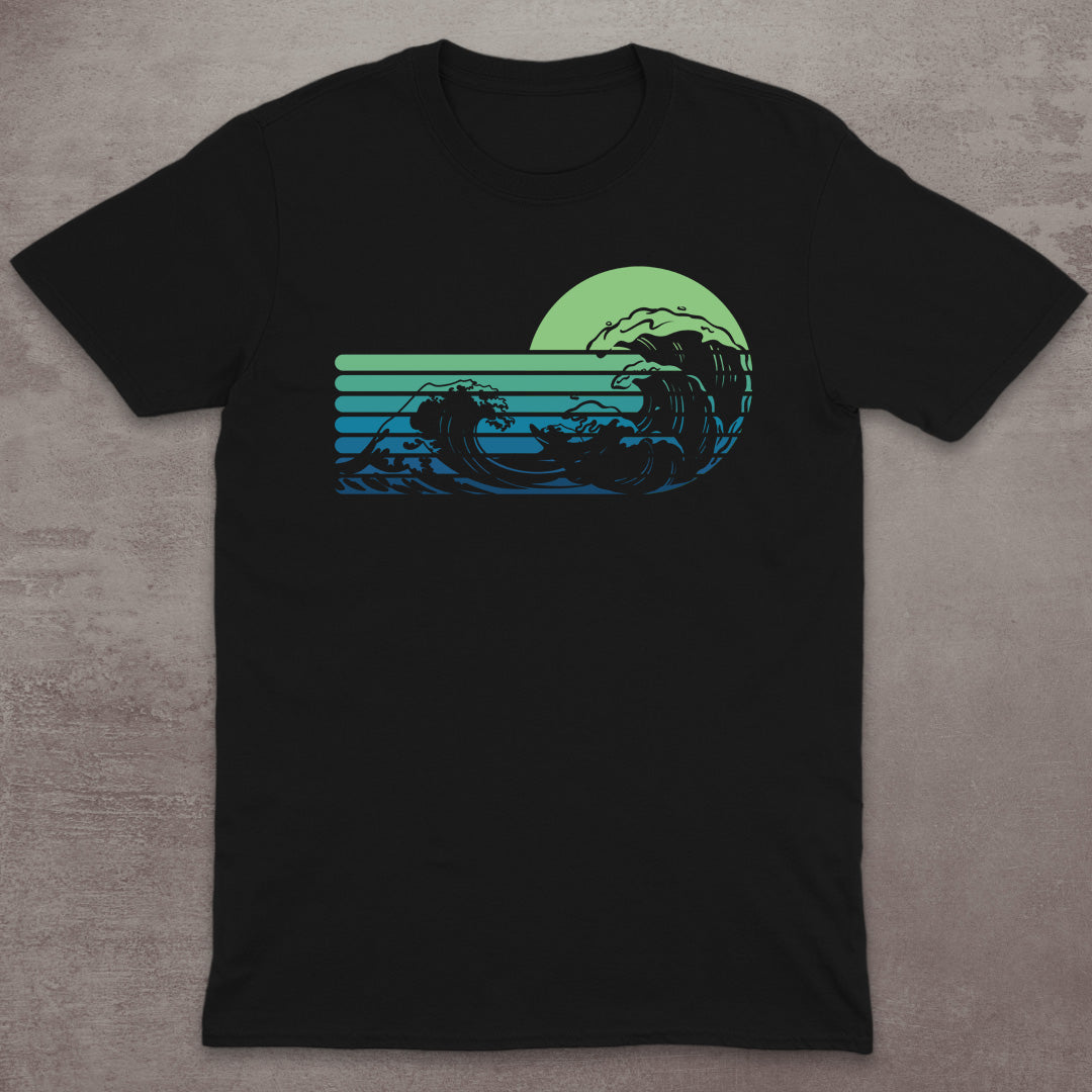 Where timeless art meets tide and style. This bold graphic fuses vintage wave forms with a striped sunset aesthetic, perfect for ocean lovers, night surfers, and anyone drawn to the deep rhythm of the sea. A standout tee with just the right undertow.