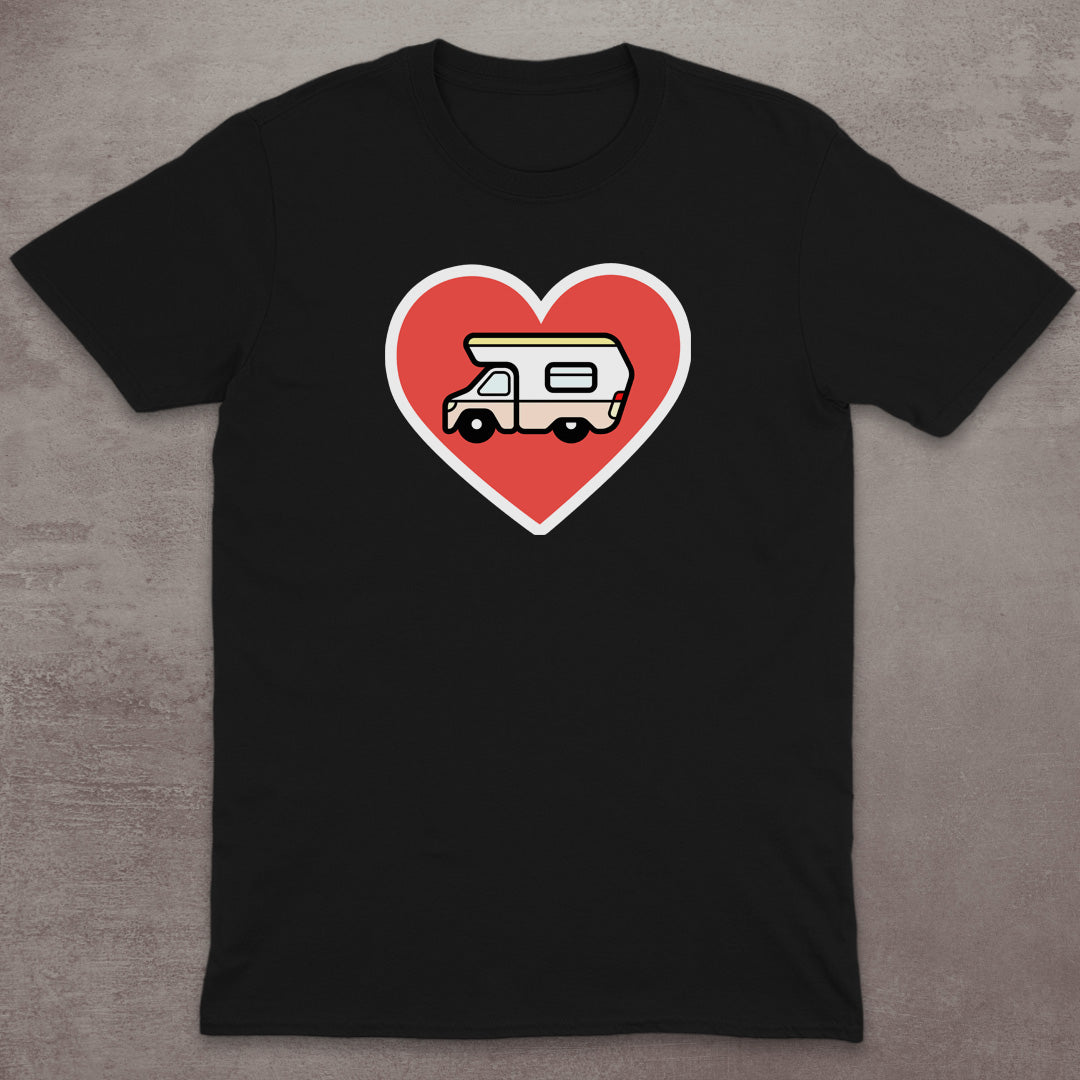 This minimalist T-Shirt features a cute RV camper van centered inside a bold red heart—perfect for vanlifers, road trippers, and travel couples. A clean and modern way to show your passion for life on the road and the freedom of open highways.
