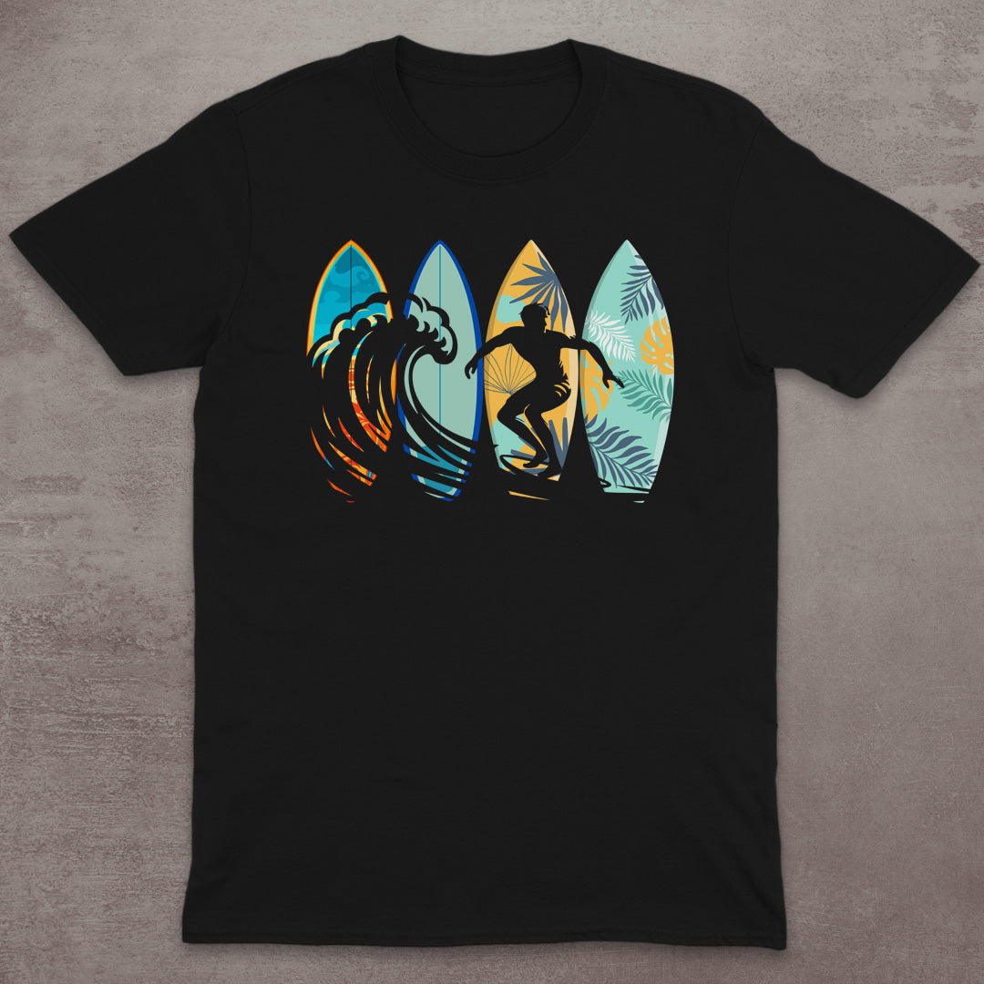 Catch the wave in style with this bold surf-themed graphic tee. Featuring a dynamic surfer silhouette over vibrant surfboard shapes and tropical backgrounds, this design is perfect for anyone who lives for sun, sand, and surf. Whether you're hitting the beach or just want to keep that laid-back summer energy year-round, this shirt brings the stoke.