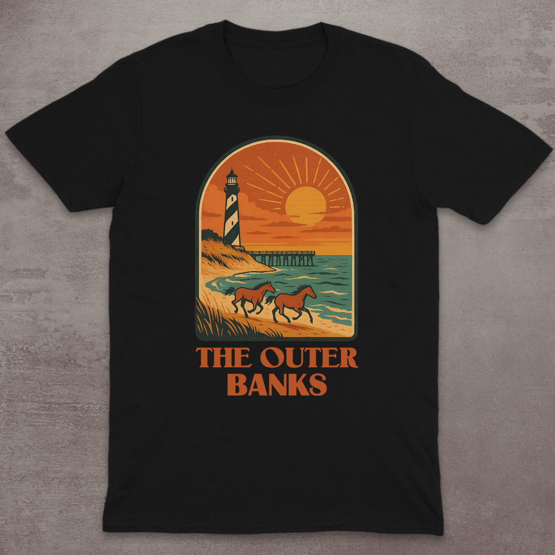 This Outer Banks T-Shirt captures the coastal charm of North Carolina’s barrier islands, with a bold sunset, wild horses, iconic lighthouse, and ocean pier. A nostalgic design perfect for beachgoers, East Coast road trippers, and lovers of maritime landscapes.
