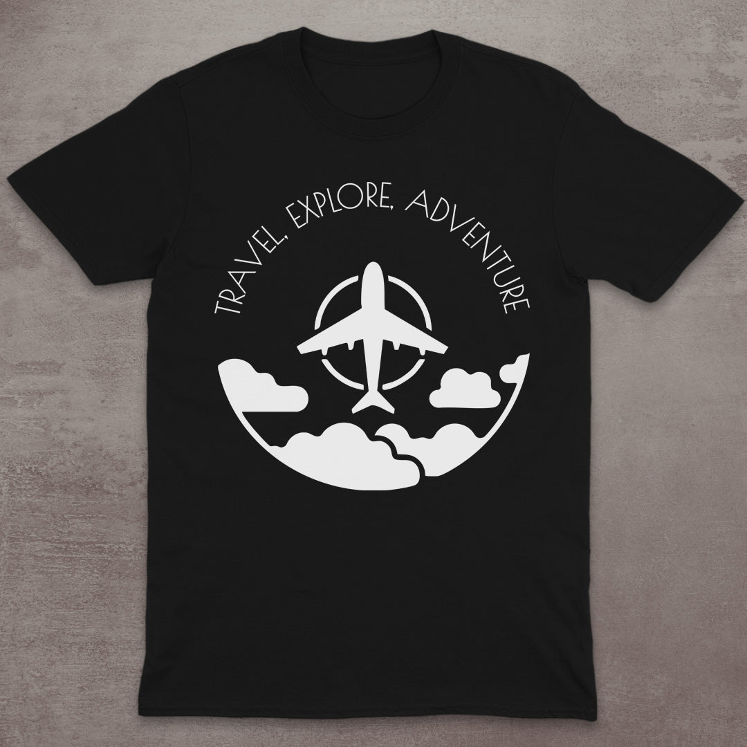 Let your dreams take flight with this uplifting "Travel Explore Adventure" T-Shirt. Showcasing a sleek airplane soaring through the clouds inside a circular frame, this design captures the spirit of freedom, discovery, and sky-high ambitionâperfect for globe-trotters and jetsetters alike.