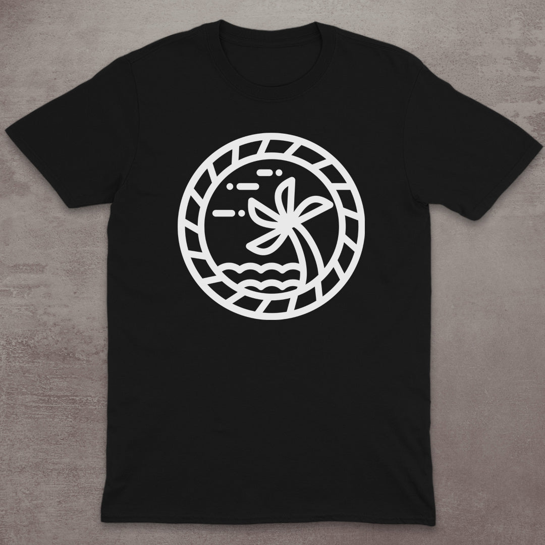 Bring vacation vibes wherever you go with this clean and stylish tropical emblem T-Shirt. Featuring a minimalist design of a palm tree, ocean waves, and breezy skies framed in a bold geometric circle, this tee is perfect for beach lovers, sun seekers, and chill souls at heart.