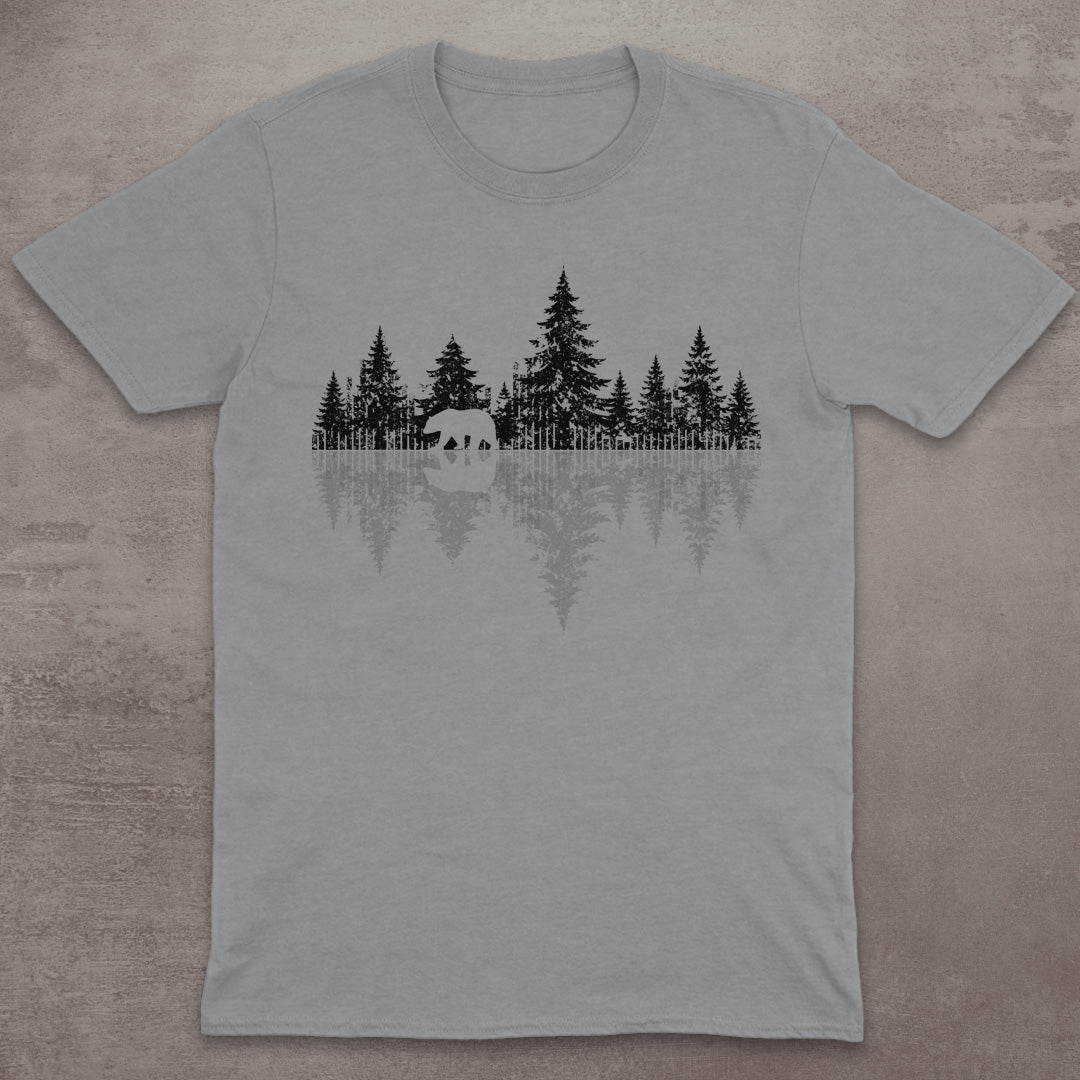 A quiet moment in the wild. This striking black-and-white design features a lone bear walking through the forest, mirrored in still water. It’s a powerful tribute to untamed landscapes and solitary strength—perfect for nature lovers, hikers, and those who feel at home under the pines.